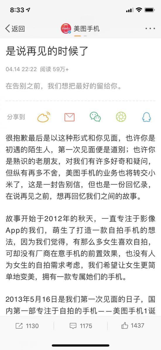 美图手机官方昨日发布长文告别信,称将在今年年中关闭手机业务,将旗下美图手机的品牌独家授权给小米集团。不过日后美图手机的售后服务还将由美图继续负责。