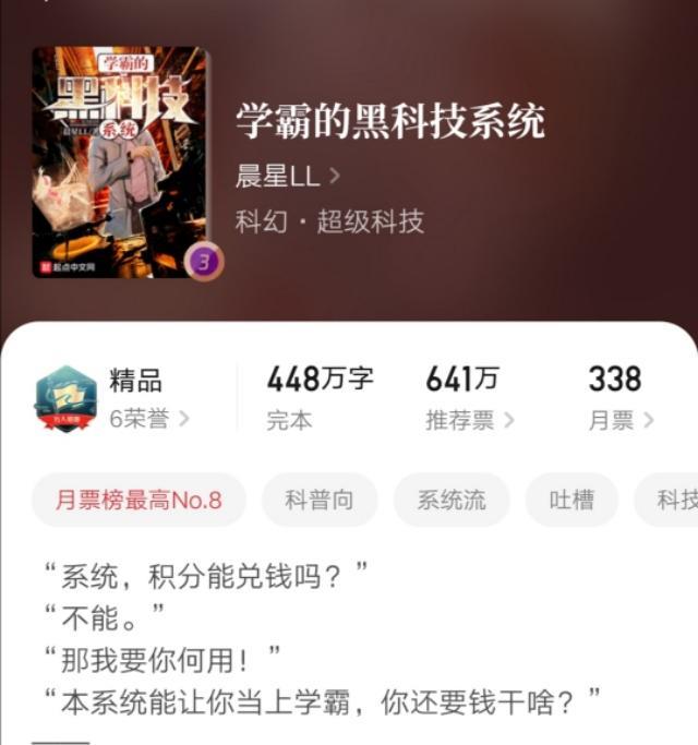 简评:对于学霸来说,积分不能兑换钱,那句“要你何用”,非常霸气。这是一本学霸文,里面融合了系统、黑科技等元素,作者文笔很好,非常接地气,毕竟不是所有读者都是学霸(学渣暗戳戳想,可能不会很多),文笔流畅,人物刻画也到位,读起来不会有滞涩感,很舒服。
