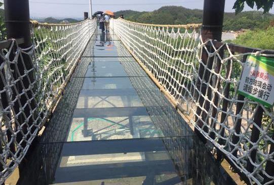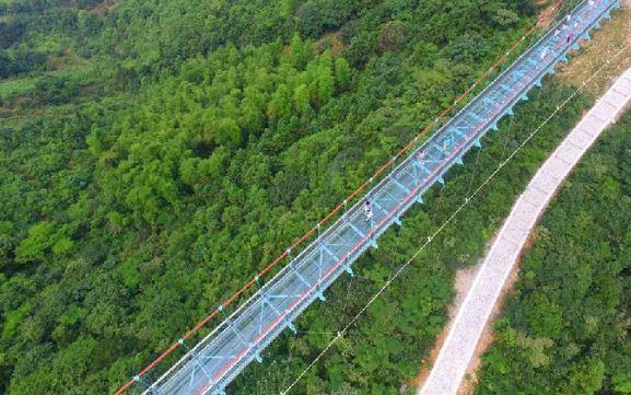 位于湖州长兴的龙山绿道玻璃悬索桥是浙江省最长的玻璃悬索桥。整座桥宽2.6米,长186米,桥面全部由玻璃铺砌成道,架设在两座山头之间。行人走在桥上,脚下就是数百米深的山谷,仿佛是在凌空漫步。