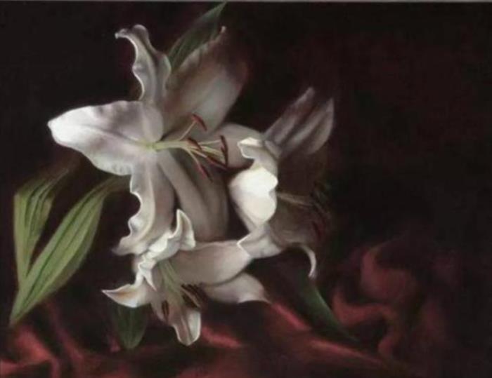 斯韦特兰娜·捷列茨画了三朵花,但是所有的细节都非常朦胧。花瓣、花蕊、绿叶,包括画作的大背景,全都无法清楚地辨析。更奇怪的是,白色的花朵后面,画家安排了一个深红的大背景,而且因为光线的缘故,大背景形成一片黑洞。可以说,整幅作品给人的感觉,和上幅一样,非常压抑。