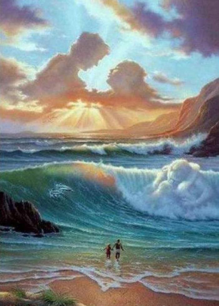 这幅画是斯韦特兰娜·捷列茨的经典代表作。画中的自然景物都非常夸张,高高卷起的海浪,透射出艳丽光线的彩云。云朵的形状还是一对恋人。而沙滩上的两个主角,尽管两手相牵,却显得十分渺小。这幅梦幻的作品,让人不禁陷入沉思。当然,看着滔天巨浪,难免让人产生压迫感和恐惧的心理。斯韦特兰娜·捷列茨的作品,都会给人造成这种压抑和幻想,比如下面这幅画,亦是如此。大家不妨再看看。