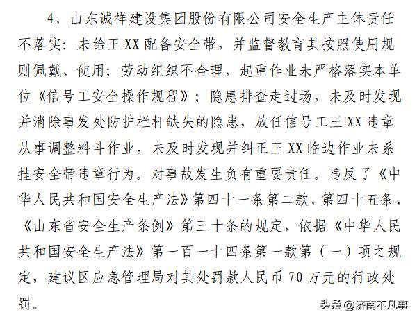 山东诚祥建设集团存在安全生产主体责任不落实,劳动组织不合理,隐患排查走过场等行为,对事故发生负有重要责任,被建议处罚70万。