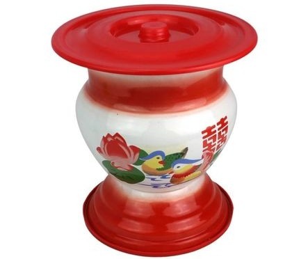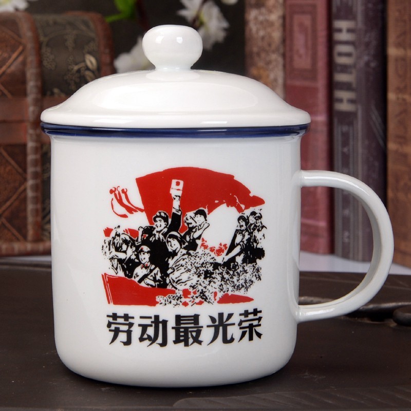 再看看下面印有大红“囍”字的搪瓷痰盂、印有大红鲤鱼的搪瓷脸盆以及写着“劳动最光荣”五个大字的搪瓷茶缸: