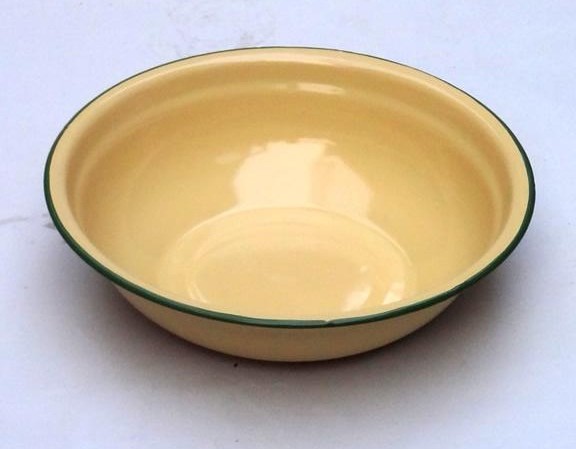 在儿时记忆里,几乎每家每户都有那么一只搪瓷盆/搪瓷碗,它们曾经是厨房的焦点,外表面呈现出鹅黄色,边沿有一圈蓝色的凸起,那时候吃饭装菜基本上都是用的这种碗。