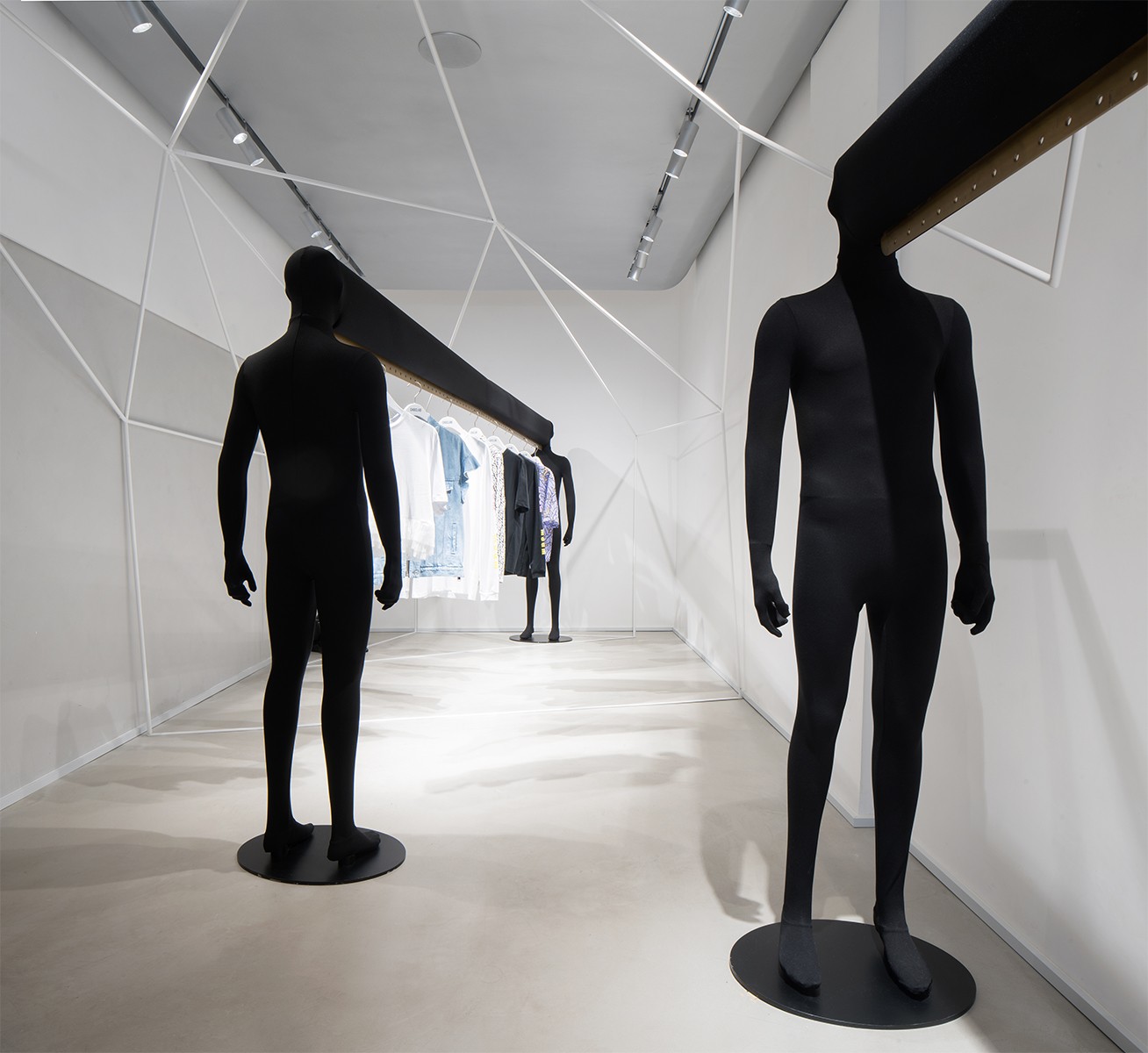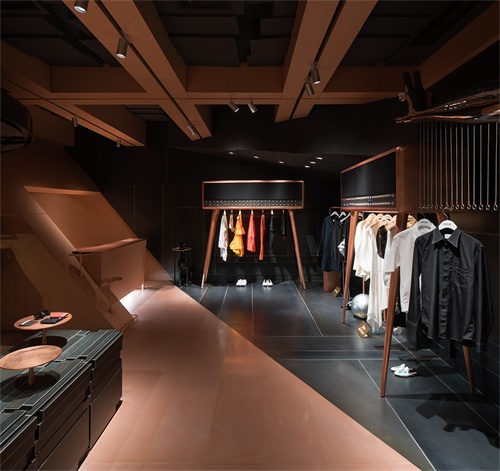 以独特的衣帽杆设计为例,衣帽架虽具有极高的使用性,却总是被以最隐晦的造型语言加以设计,最后成为墙角边不起眼的存在。但CHOCLAB却替换角度概念,将如此实用的设备摇身一变,成为店铺陈列空间的最为“抓马”的主角。人形模特式的陈列架,夸张且特殊的形象概念,彻底颠覆大众对于衣帽架在买手店中所出现的印象,既满足了当季衣款陈列的功能,又呼应了店铺主旨为顾客“潮人”服务的寄望。