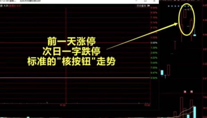 前面说冲天炮是股票由弱转强的过程,与之对应,核按钮就是股票由强转弱的过程,经常出现在行情末期的龙头股上,已开盘或者收盘阶段居多,比如12月8日丹化科技就是一个典型的开盘阶段的核按钮,核按钮是最极端的风险信号,持股者不惜成本以一种近乎自杀式的手法卖出持有的股票,说明对于后市极度看空,但是有时候呢,极度的悲观情绪之后,由于存在巨大的价差,就会吸引抄底资金进场,导致情绪反转,甚至出现当日核按钮次日冲天炮的历史罕见走势,郑州煤电11月25日涨停,11月26日被核,11月27日从跌停再冲涨停,走势堪称奇观。