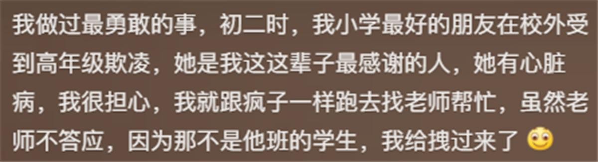 你做过最勇敢的事是什么?网友们纷纷来评论,每条都能吹嘘一辈子