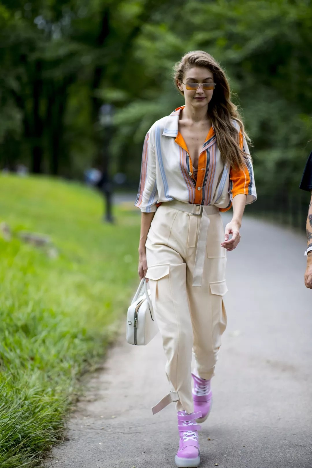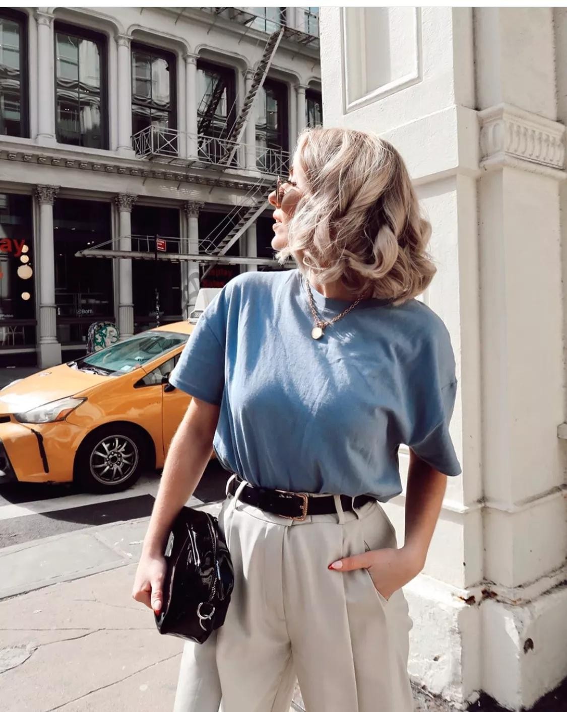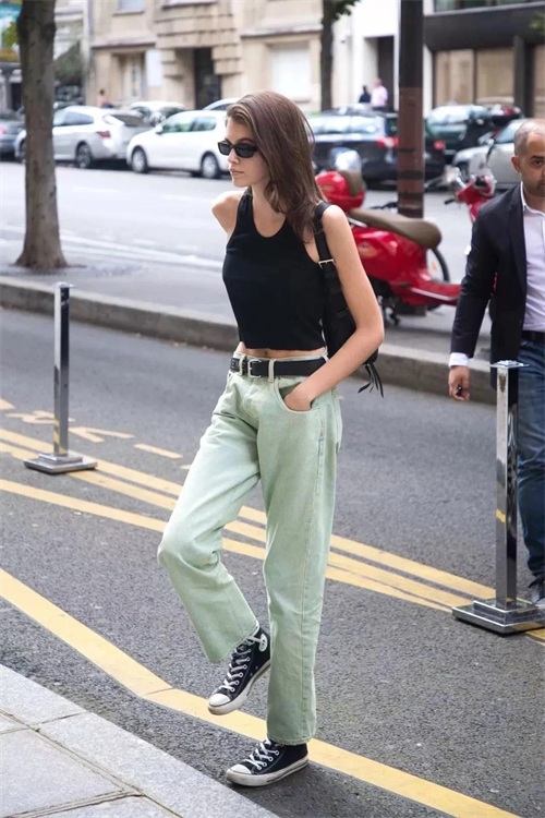 今年非常流行一种露脐装的短款上衣,长度大概在腹部与肚脐之间,展露腹部线条美的同时以腰部为分界线,达到上短下长的效果。这样版型的上衣对没有马甲线和人鱼线的女生也很友好,在视觉上使胸部的丰满效果与腹部形成鲜明对比,能弱化上身肉感哦。