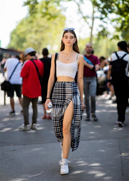 吊带与露脐装不同的地方在于,露脐装可以有一些泡泡袖,方领版型或碎花款式设计,而吊带多以纯色搭配出现,适合与性感的开叉裙搭配。使上身的无袖效果与下身的开叉风格形成呼应。对于半裙的选择可以有一些格纹或条纹的图案设计或者硬挺的牛仔材质也很不错。