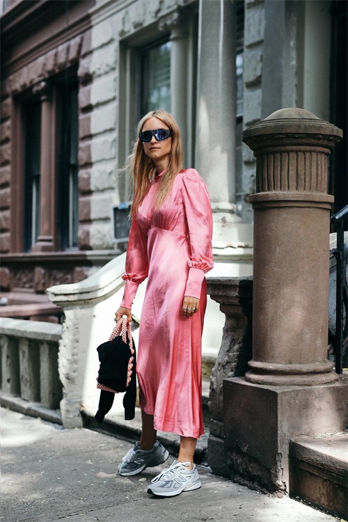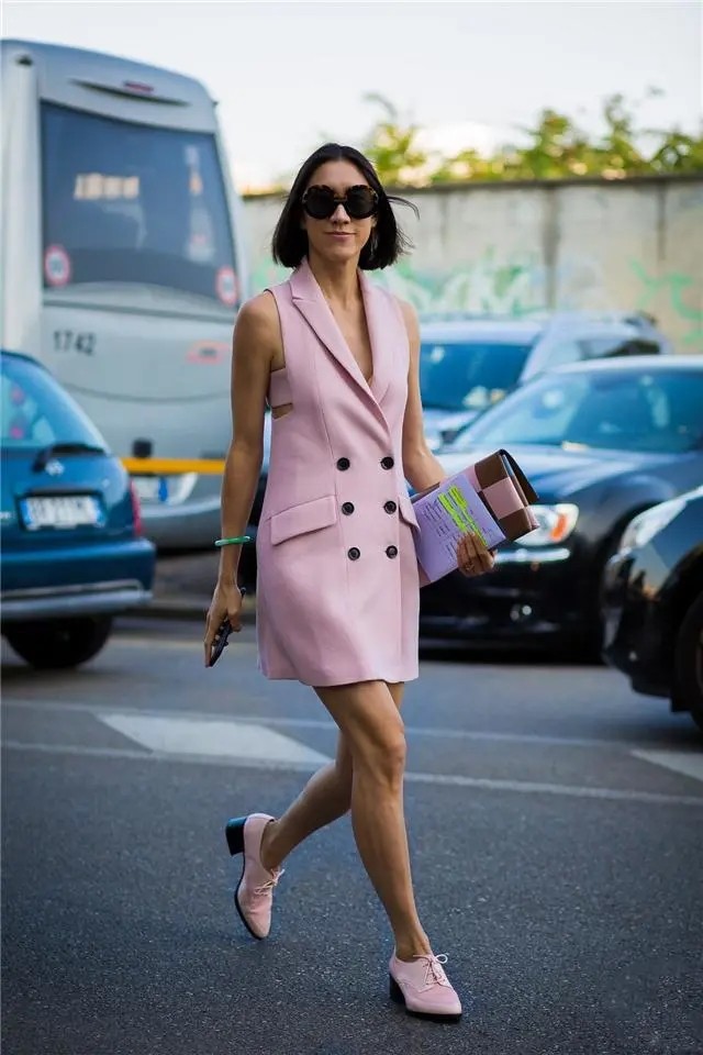 弱化大胸身材的臃肿效果也可以通过改变领口来实现,比如今年非常流行V字领口,这样的剪裁能够在视觉上拉伸颈部线条,使肩部得到调整和扩张效果。这样好看百搭的设计在夏季绝对是福利选择了,不仅可以出现在一些裙装及上衣中,对于西服也同样适用。