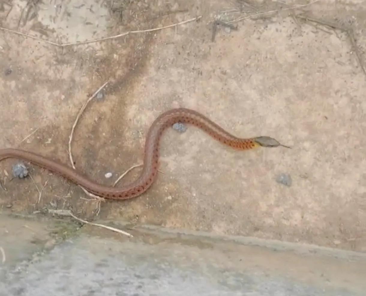 据这位村民说,他当时是在自家菜地里干活,偶然间发现菜地边上的水沟里有条蛇,还是红色的,很少见,于是引发了他的好奇心,他用手机追着这条蛇拍了一段视频。