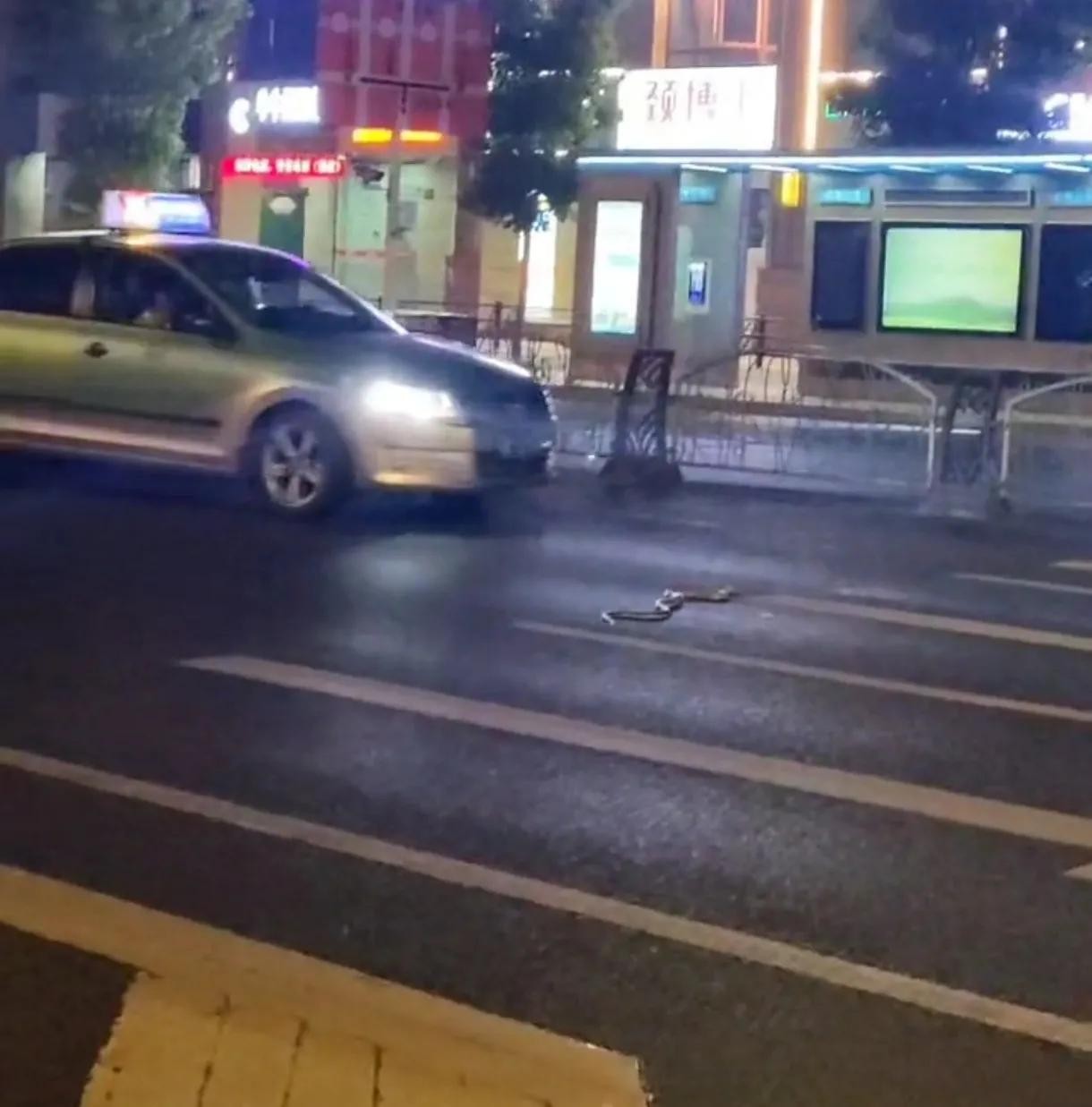 3、浙江嘉兴,网友在城区大街上拍到1条蛇过马路,差点被车轧