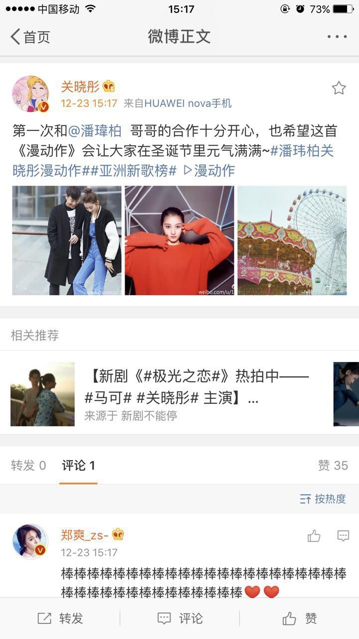 “第一次和潘瑋柏哥哥的合作十分开心,也希望这首《漫动作》会让大家在圣诞节里元气满满!”关晓彤在微博里表示道。