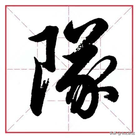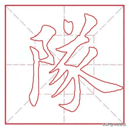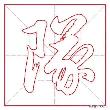 “阝”不要写宽,以露锋入笔,向上大抗肩,横画勿长,然后稍提锋顿笔再折锋向左下渐轻行笔,接着拐弯向右下弯行,到挑钩处向左上方引毫出锋,小巧精致;竖画起笔稍低,稍左斜,不要写重,中间稍细,稍带弧度,收笔垂露,不可悬针。