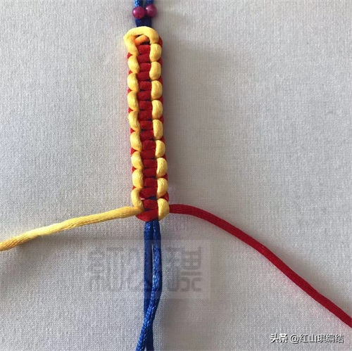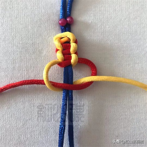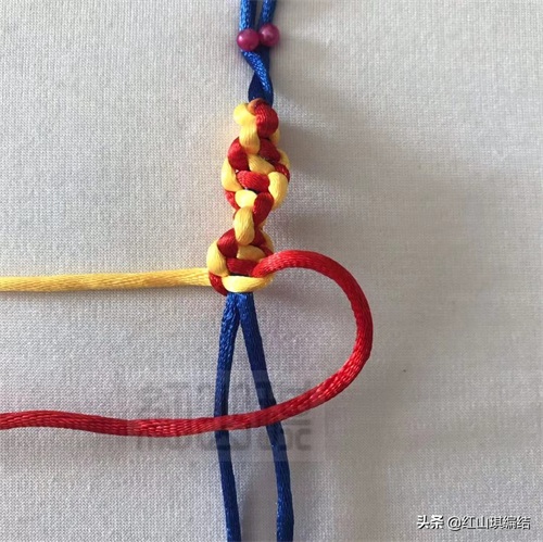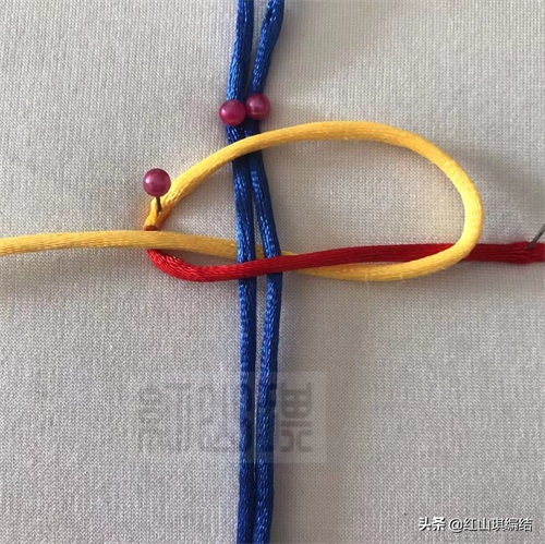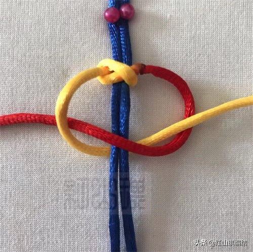 黄绳按图压红绳从蓝色短绳后面穿环