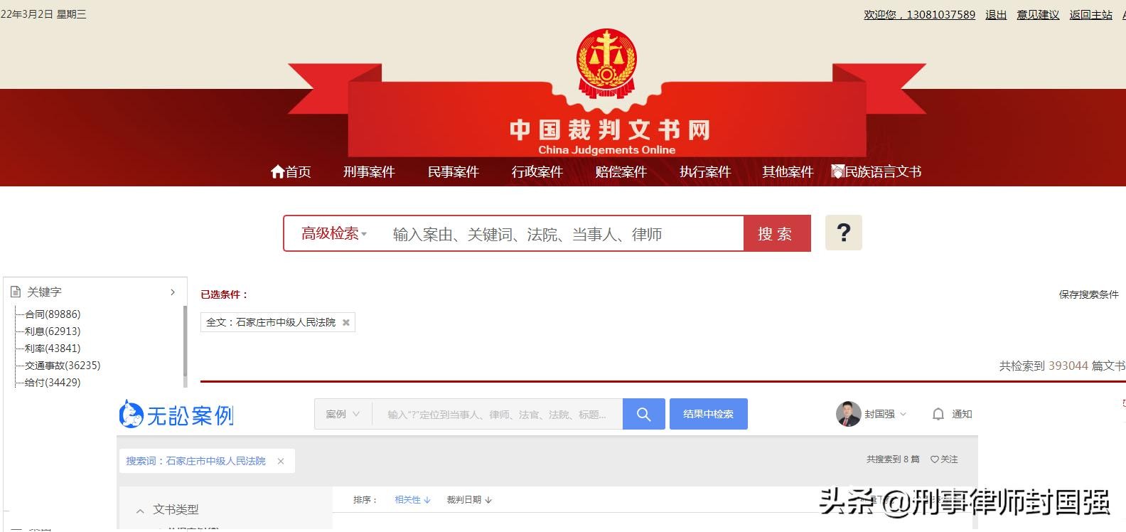 检索“石家庄市中级人民法院”裁判文书网显示393044篇文书,而无讼案例显示8篇。