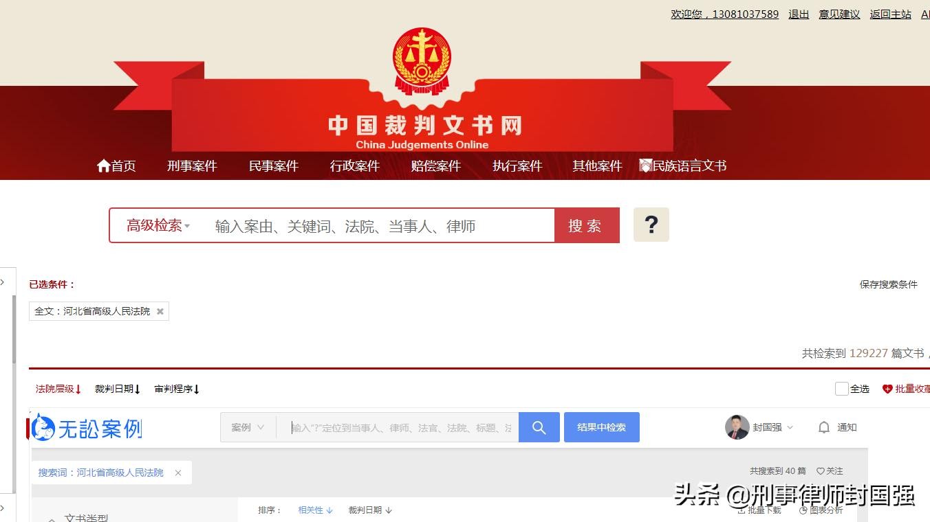 检索“河北省高级人民法院”裁判文书网显示129227篇文书,而无讼案例显示40篇。
