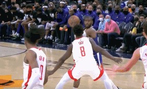 如图所示,保罗弧顶想将球传给内线的艾顿时,他的右手一记直塞,被防守的泰特不仅仅破坏,并且泰特的右臂正打到保罗的右手上,造成保罗传球失误的同时,还让他的右手出现受伤情况,于是,保罗十分恼怒。