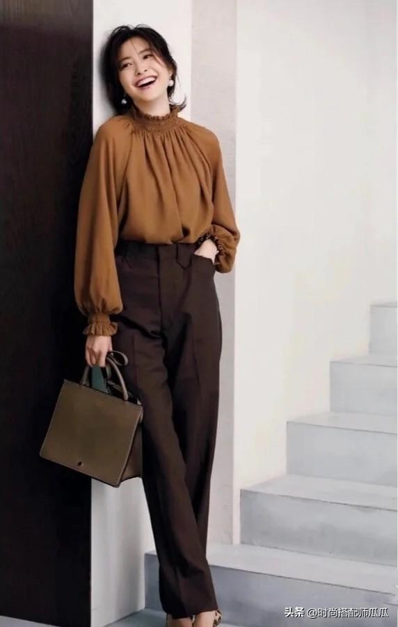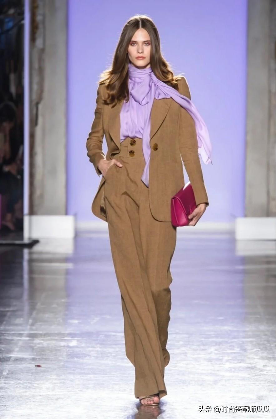 在这套穿搭当中,主要以大片的咖色为主,紫色作为点缀。紫色明亮的色调可以减少咖色带来的沉闷感,大片的咖色也会使我们的服装色彩看起来更加统一协调。选择绸质的上衣,可以让我们的穿搭看起来更轻盈更有质感。