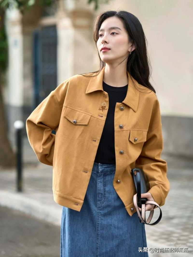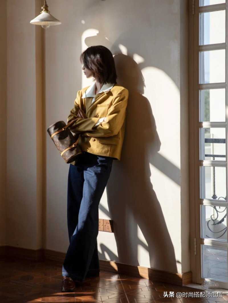 穿搭推荐1:姜黄色短外套内搭尖领衬衫+蓝色牛仔裤