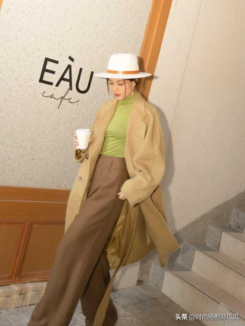穿搭推荐:浅驼色大衣+牛油果绿高领内搭