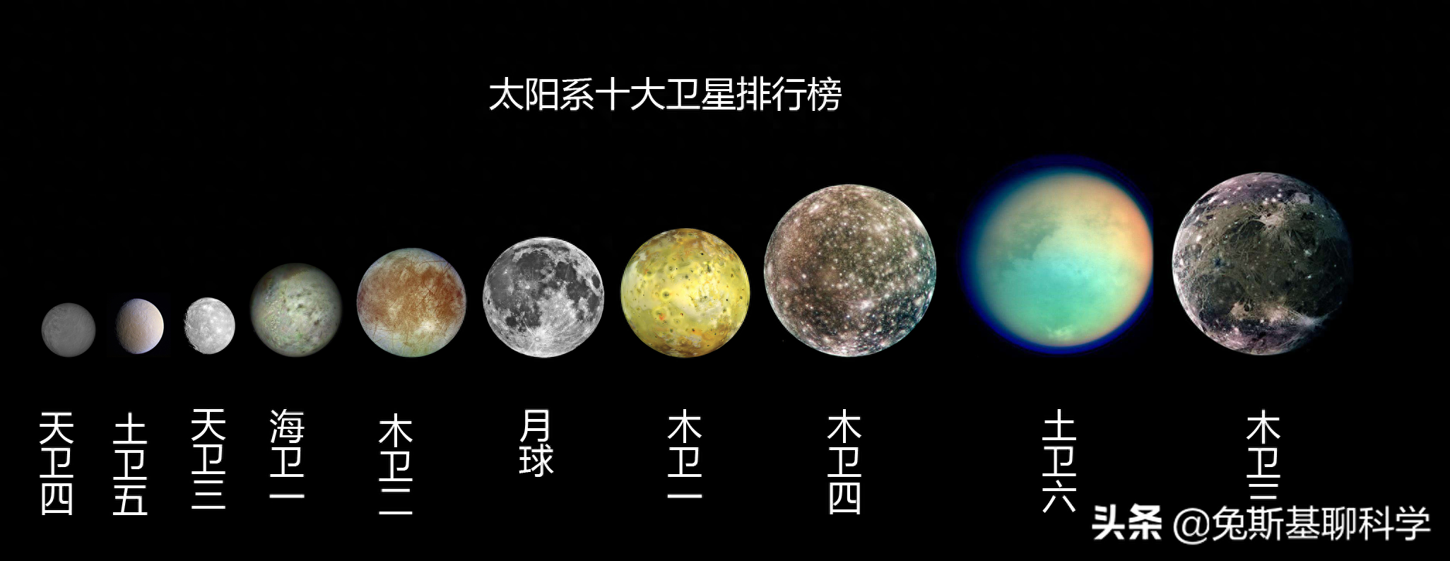 这就是太阳系中按体积大小排名前十位的卫星。在这些卫星中月球的大小排名第五。木星的卫星占了四颗,土星有两颗卫星入选,天王星也有两颗。