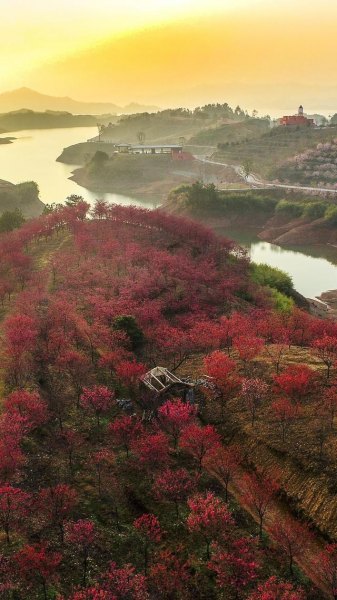 2023年3月3日,浙江淳安,界首乡鳌山现代观光农业园,上万株不同品种的樱花竞相怒放,漫山遍野绵延山头。