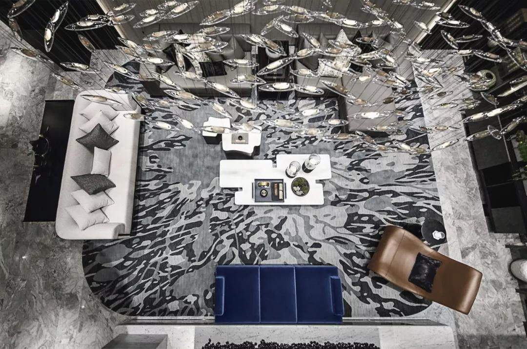 在嘉兴,下雨仿佛是一种日常。这种自然意象也被演绎于地下空间里,垂落而下的玻璃灯像雨滴般编织梦幻的花语江南,丝丝溶入地毯的江河之中,带来梦幻与诗意,使人仿佛游走在江南的烟雨中,时间被静止,舒服又惬意。