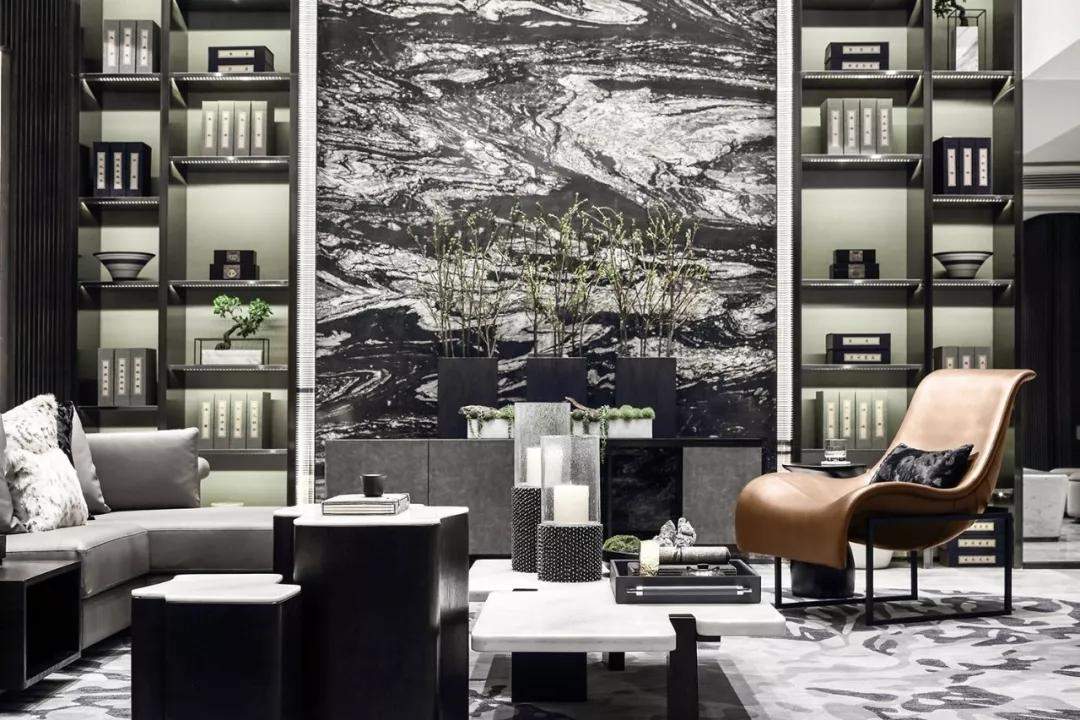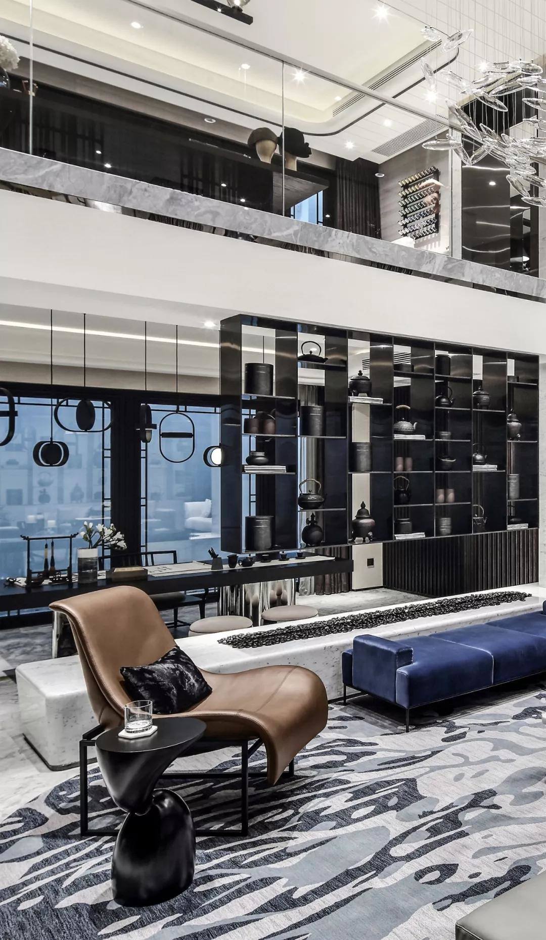 会客厅巧妙地连结吧台区与书房品茗区,每个空间看似独立却又相互串联。这是设计师的“刻意为之”:“中西生活方式合并,看似彼此矛盾,却也产生恰到好处的融合之美。独立使用的时候可以保证功能分区,但当他们合并在一起,生活也就有了重叠。”