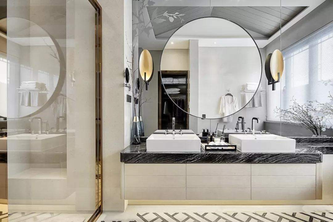 二层主卧室与浴室则是室主人温柔的体现。设计师将”花语”意境元素带入设计中,在拉门门片及浴室灰镜中加入枝丫和花鸟图腾。壁纸配以柔和稳重、不事张扬的“高级灰”,仿佛可以看见居者身上所散发出的柔和低调、优雅的江南气质。