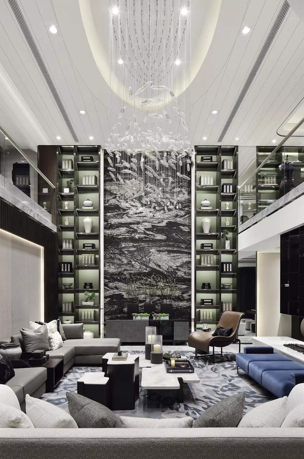 设计充分利用地下空间超高的挑空,塑造出优越、仪式性的生活空间效果,配以典雅的材质及高耸的书架让人眼前一亮,地下空间完全的开放与融合,为室主人营造出一个灵动,丰富有趣的生活场景。