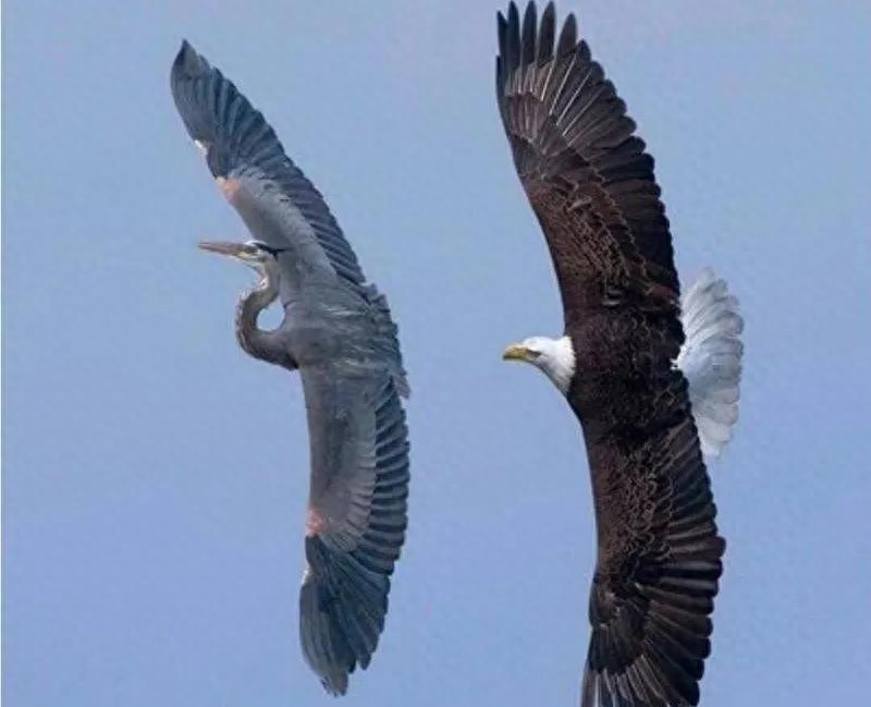 6.白头雕在空中捕食苍鹭。比翼双飞的不一定是情侣,还有可能是猎物与猎手。