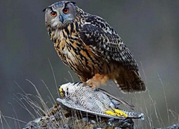 35.雕鸮干掉游隼。在绝对力量面前,游隼的技巧和速度毫无作用。雕鸮是世界上第二大的猫头鹰,第一是毛腿渔鸮。