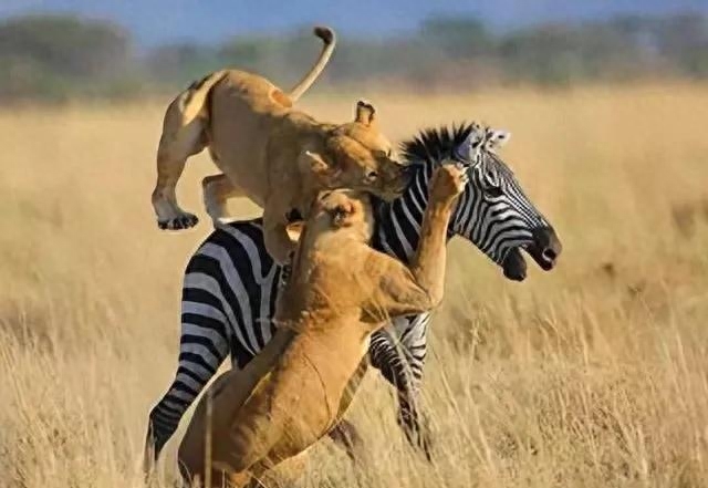 2.两只母狮在捕捉一只斑马。狮子是群居动物,但它们的内部分工令人颇感意外。在狮群中,雄狮负责巡视领地、为母狮、幼狮保驾护航,而母狮的任务是狩猎。