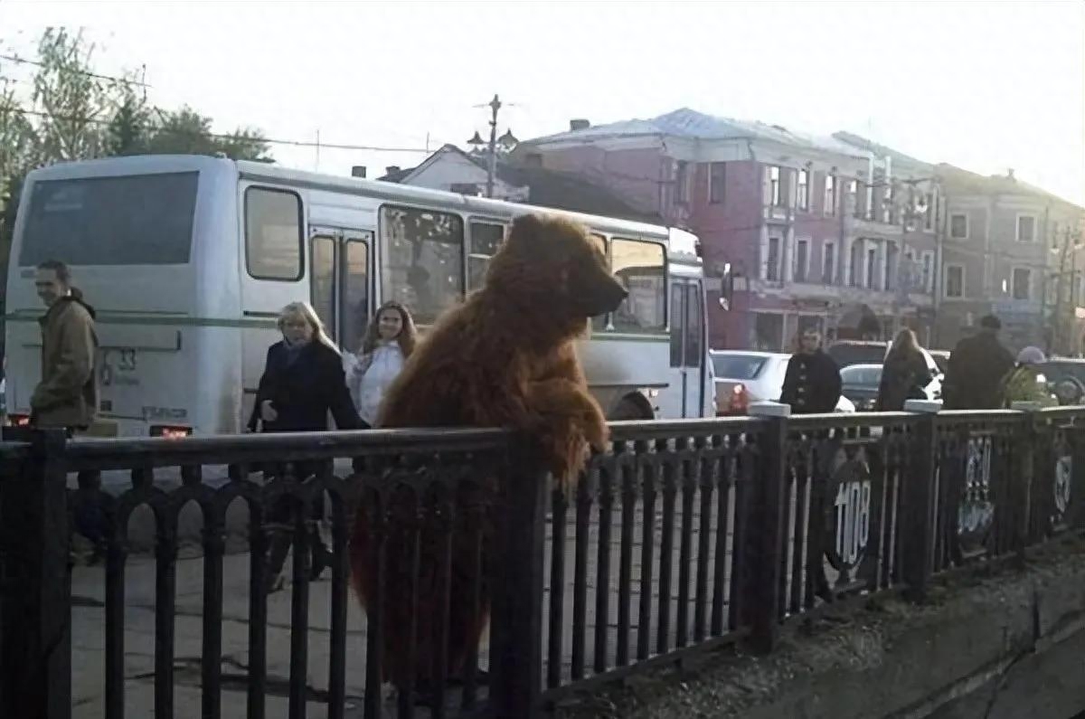 8.熊在俄罗斯逛街。在战斗民族眼里,熊是宠物,危险系数不高。这哪是宠物啊,这是个保镖!