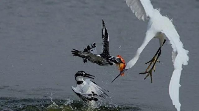 32.白鹭在空中抢夺其他鸟类的猎物。白鹭一身洁白,却干着腹黑之事。都是为了一口吃的,不容易,大自然是残酷的。