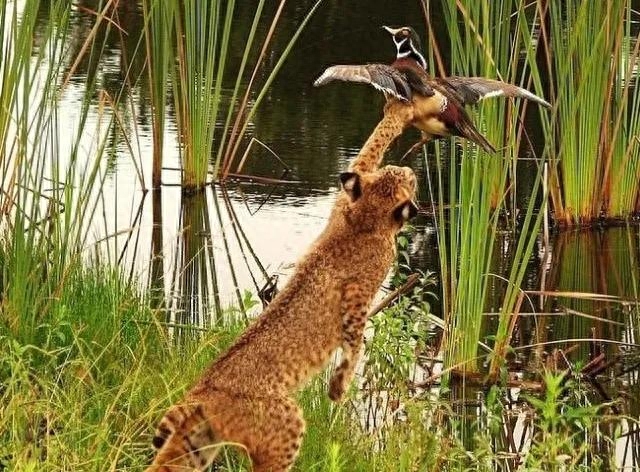 31.猞猁一跃而起,野鸭在劫难逃。猞猁的捕猎能力太强了。它是最全能的杀手。不要怀疑,猞猁可以杀死大灰狼。
