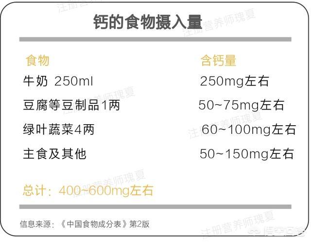 首先我们需要大概知道,我们每天靠食物能获得多少的钙。这里举个例子大致计算一下,大家可以根据自身情况做个估计。