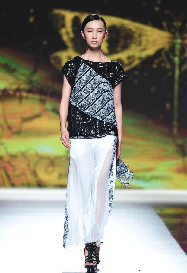 贾晨宇的身材还是挺不错的,真是行走的衣架子,模特的身高和身材真是吃香啊,在穿衣服上面就比其它人多了一点优势,这件衣服穿在身上依旧是很好看的,上衣中间的部分是倾斜的灰色,两边是黑色,形成对比具有层次。然后裙子也是很飘逸的,薄纱的设计很飘逸