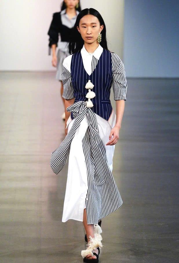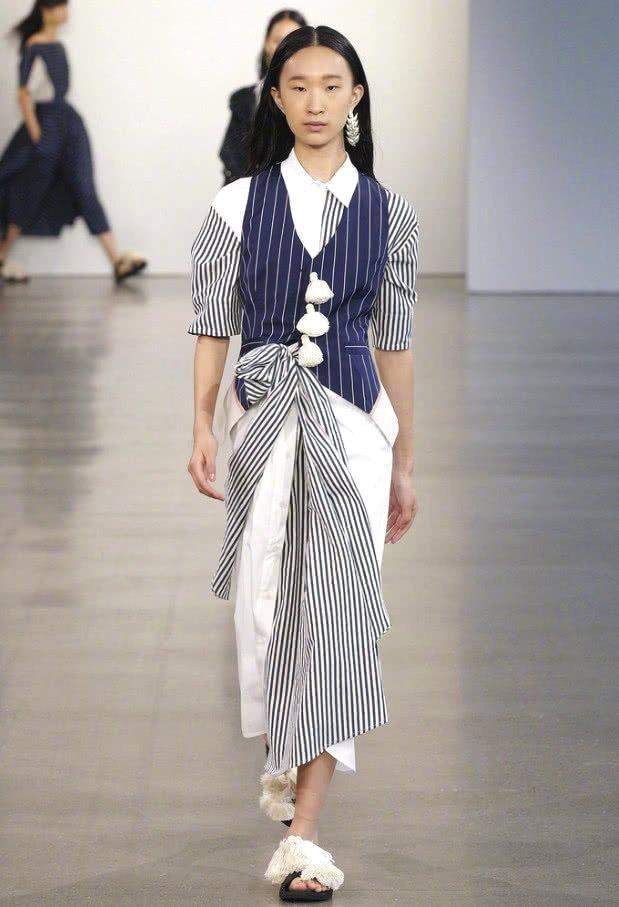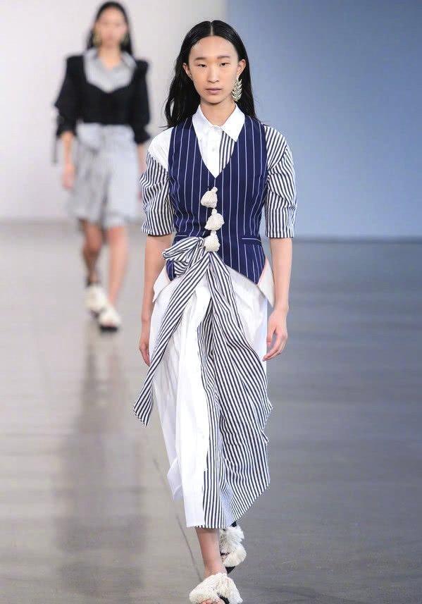 贾晨宇的长相是比较偏中性的,看起来稍显阳刚,但是身上还是有很多的女性的气质在里面的,她的穿着上面也是很时尚潮流,这件走T台穿的衣服既有男性的魅力也有女性的柔美在里面。上衣穿了一件蓝色的马甲,里面还有件黑色条纹的衬衫,而在马甲上面还有三个半白色的吊坠的挂饰也是很别致。