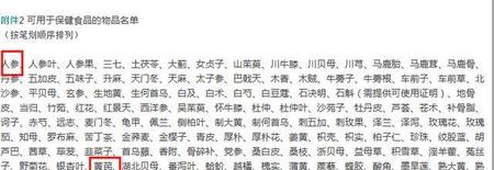 《卫生部关于进一步规范保健食品原料管理的通知》文件附带公布了三个目录:《既是食品又是药品的物品名单》、《可用于保健食品的物品名单》和《保健食品禁用物品名单》,《既是食品又是药品的物品名单》就是我们所说的药食同源目录。人参、黄芪是被分在了《可用于保健食品的物品名单》。