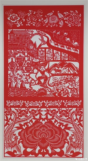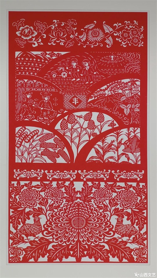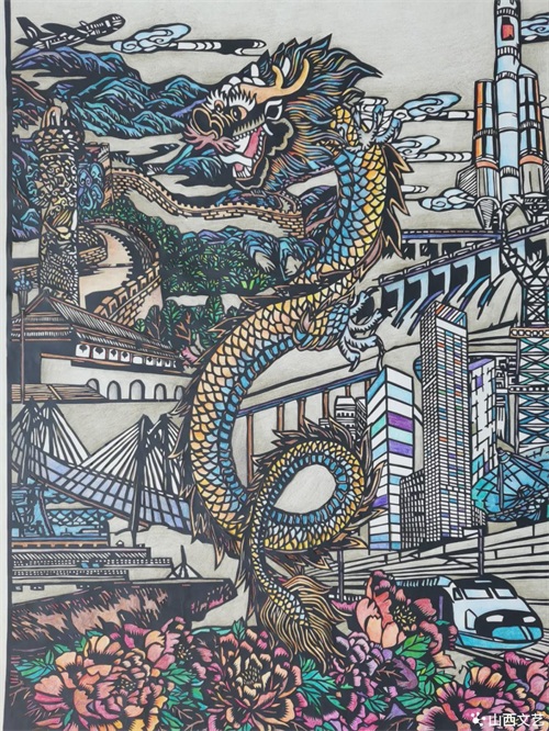 作品用套色剪纸的形式,把缤纷的色彩、生动的形象、祖国的大好河山、科技的发展都展现出来,祝愿祖国更加繁荣昌盛。
