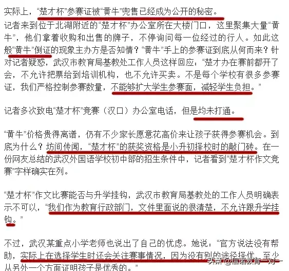 看明白了吗?一知半解,但明白了为什么家长四处求参赛证。实际上,“楚才杯”参赛证被“黄牛”兜售已经成为公开的秘密。打开央广网新闻(2018年3月22日),我们看到这样一篇报道: