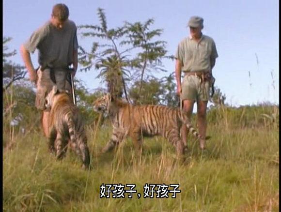 这两只老虎只有七个月大,是亲兄妹,分别叫罗恩与朱莉。约翰和大卫首先带它们来到南非的菲达野生公园,这里的山林条件十分适合传授它们野外求生技能。对于纯野生的老虎来说,小老虎要和虎妈生活2~3年才离开,可到了这里,约翰和大卫就是它们的虎爸和虎妈。