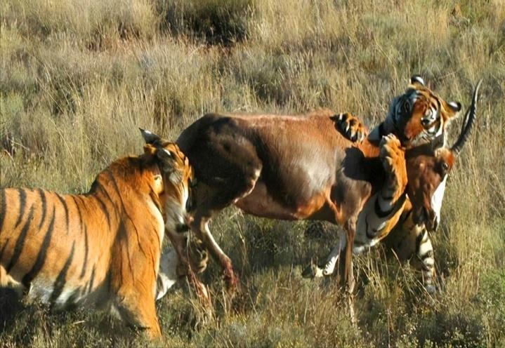 当老虎来到能风驰雷电的非洲大草原时,它们将释放出自己的全部能量,那时,才是真正大展拳脚的时候。以它们的高智商,看着狮子、鬣狗、野狗等食肉动物是群居生活后,老虎肯定也会逐渐向群居生活靠拢。