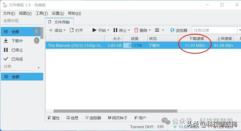 再来用文件蜈蚣下载。同一个种子,同时间段,文件蜈蚣的下载速度居然达到了11M!其实它刚才的最高峰值曾达到过23M,我没做截图而已。这下载速度,简直是吊打上面的某雷啊。