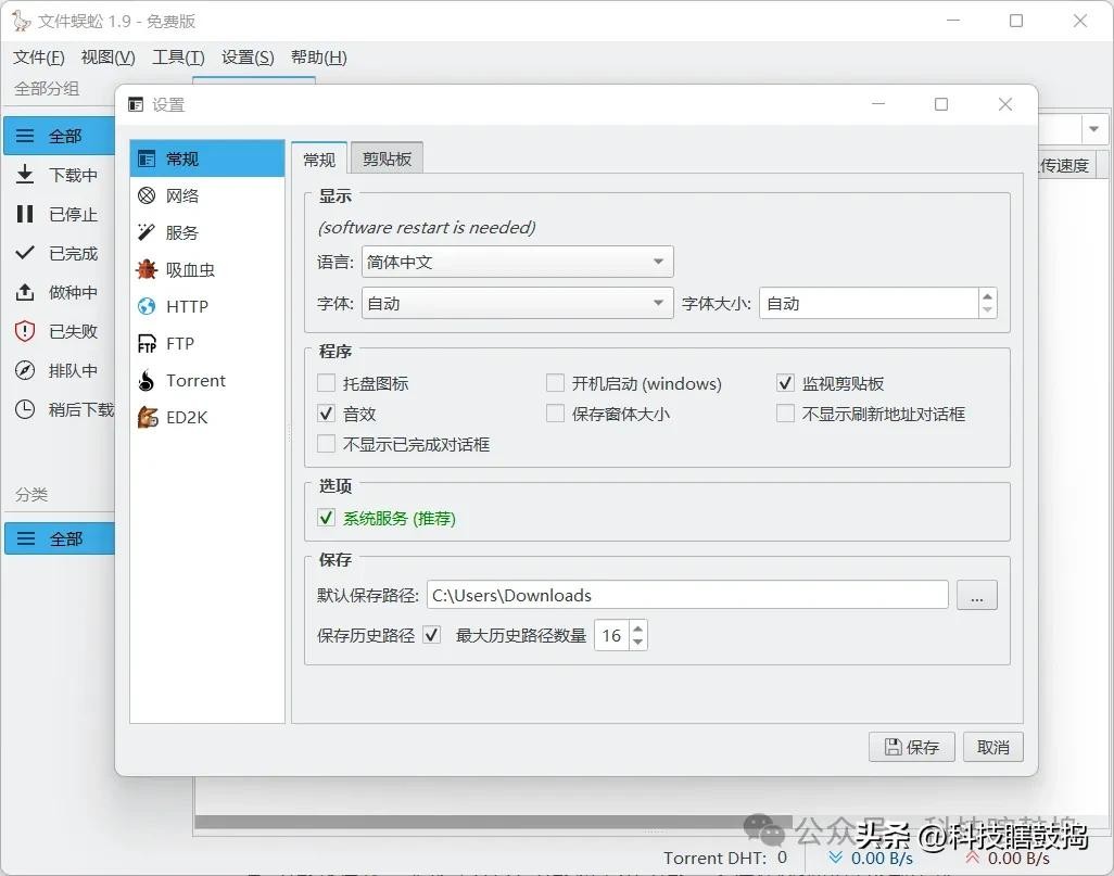 2、在设置里,可以设置各种参数,如语言、保存路径、下载任务数量、上传或者下载速度、设置并发连接数等等。