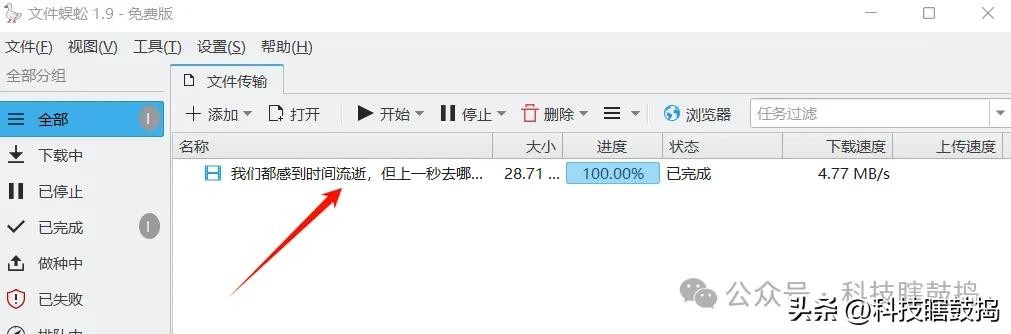 返回到文件蜈蚣的主界面,可以看到下载列表里,这个视频已经下载完成了,速度非常快!