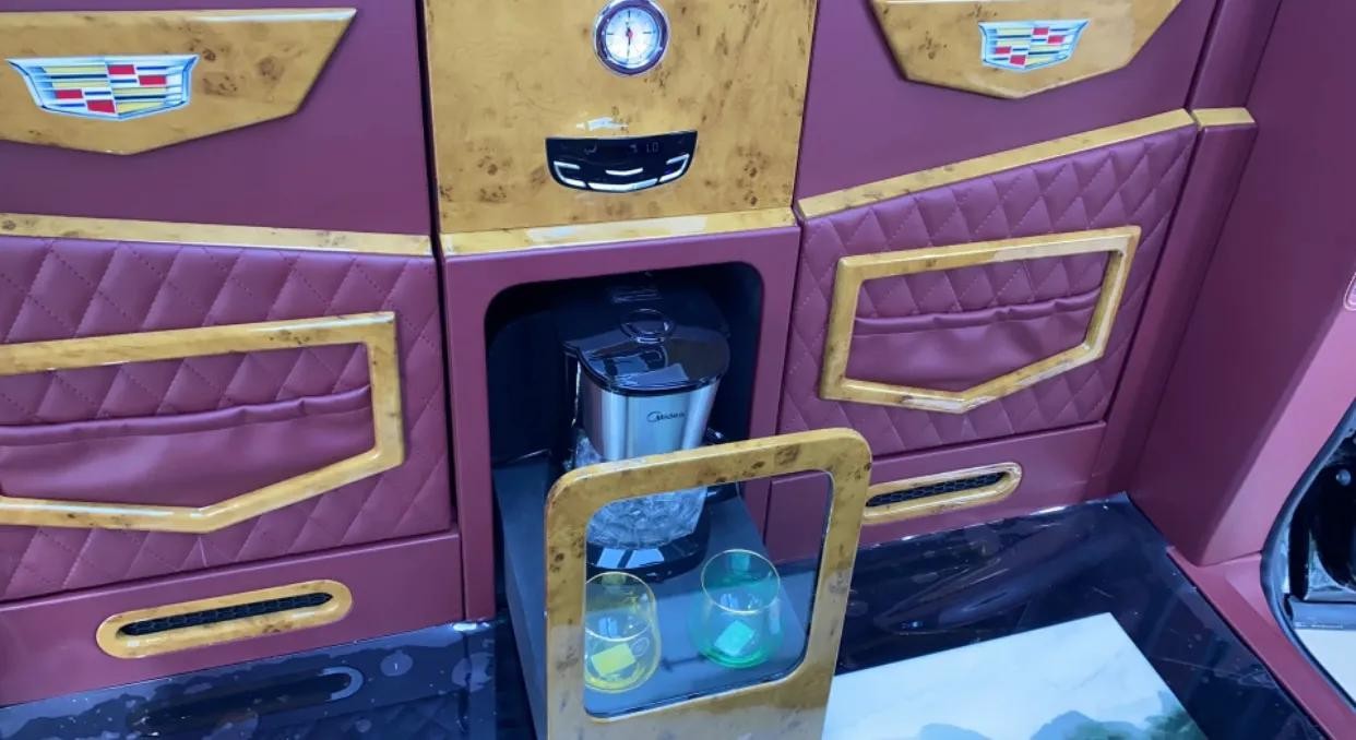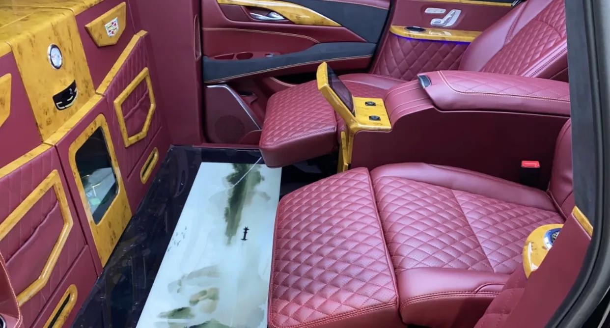 18款凯迪拉克总统一号桌椅设置操控屏,简单方便,扶手台影藏一个简约的储物柜。奢华游艇木地板,有种复古格调凯迪拉克总统一号凯迪拉克总统一号让你在商务谈判中更胜一筹,全车采用真皮包裹拥有透气性、电动按摩及电动加热系统,保证整了质感的同时也保证了座椅的舒适性。