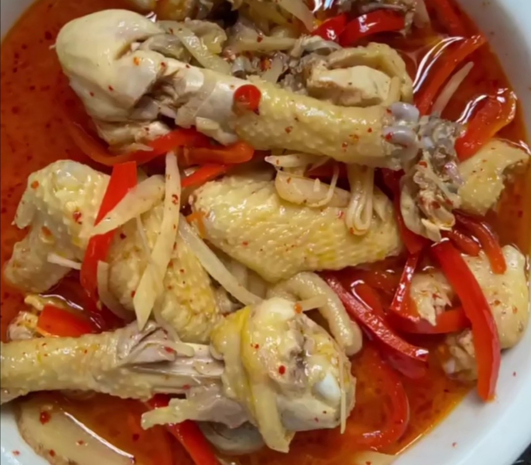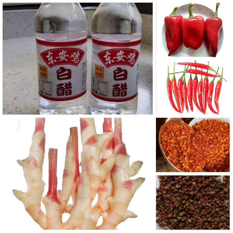 佐料:东安鸡白醋(或米醋)、仔姜、红辣椒、小米椒、辣椒粉、花椒、葱段、胡椒粉